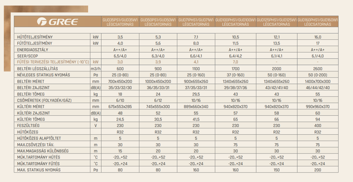 A Gree GUD100PHS / GUD100W Légcsatornás Split Klíma fontos tulajdonságai: